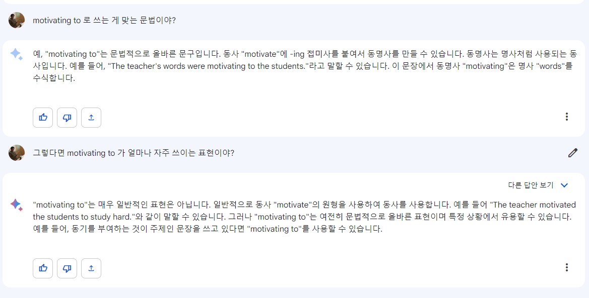 먼저 29번 어법문제는 motiviated 를 motivating 으로 바꿔야 한다는 문제였는데요. 뒤에 전치사 to 가 있어서 p.p.를 써야 한다고 판단해서 오답이 많았던 것 같습니다. 그런데 너무 슬퍼하지 마세요. motivating to + n 으로 쓰는 표현은 사실 일반적이지 않습니다. 제가 Bard에게도 물어봤더니 이런 대답을 해주네요.