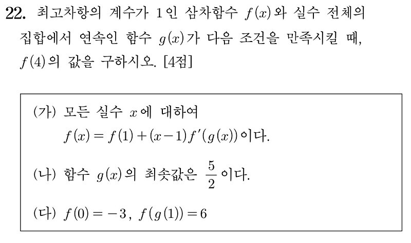얼핏 보면 f(x)는 삼차함수의 모양새를 하고 있기에 대부분의 학생들은 (가) 조건을 의도대로 해석하지 못한 채 삼차함수로 잡고 풀다가 장렬하게 전사했고, 결국 이 문제는 수능 역사상 최고난도 문제를 논할 때에는 빠지지 않고 등장하는 문제가 되었습니다. 그리고 기울기 조건에 대한 아이디어는 이 문제의 난이도를 올리는 일등공신이 되었죠.