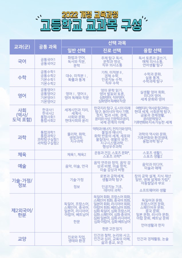 이처럼 국, 수, 영, 사, 과의 공통과목은 필수로 이수해야 하며, 그 외의 체육, 예술, 기술가정, 정보, 제2외국어, 한문, 교양과 같은 교과군에서도 최소의 필수 이수 학점은 충족해야 하니, 내가 예술 과목이 싫다고 아예 수강하지 않을 수는 없다는 의미입니다 ^^;