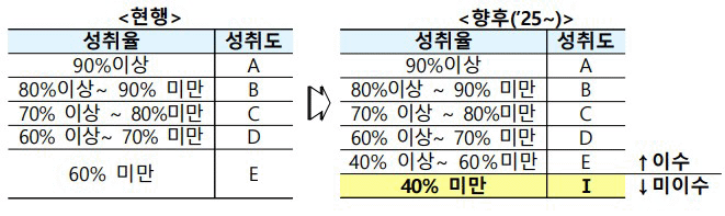 성취평가란 일종의 절대평가로, 교육과정에 나와 있는 성취기준에 얼마나 도달했느냐를 A-B-C-D-E-I의 성취도로 평가하는 것인데요. 여기서 I는 미이수를 뜻하는 'Incomplete'를 의미합니다.