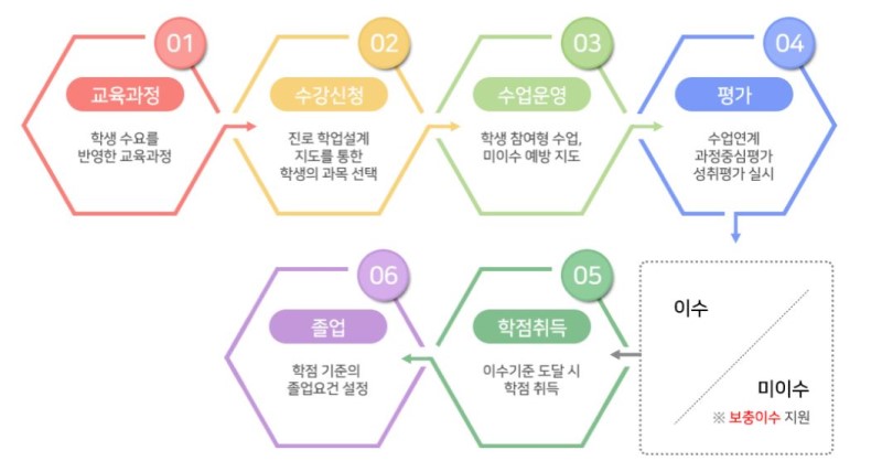 학생이 기초 소양과 기본 학력을 바탕으로 진로·적성에 따라 과목을 선택하고, 이수기준에 도달한 과목에 대해 학점을 취득·누적하여 졸업하는 제도 (교육부, 2021)