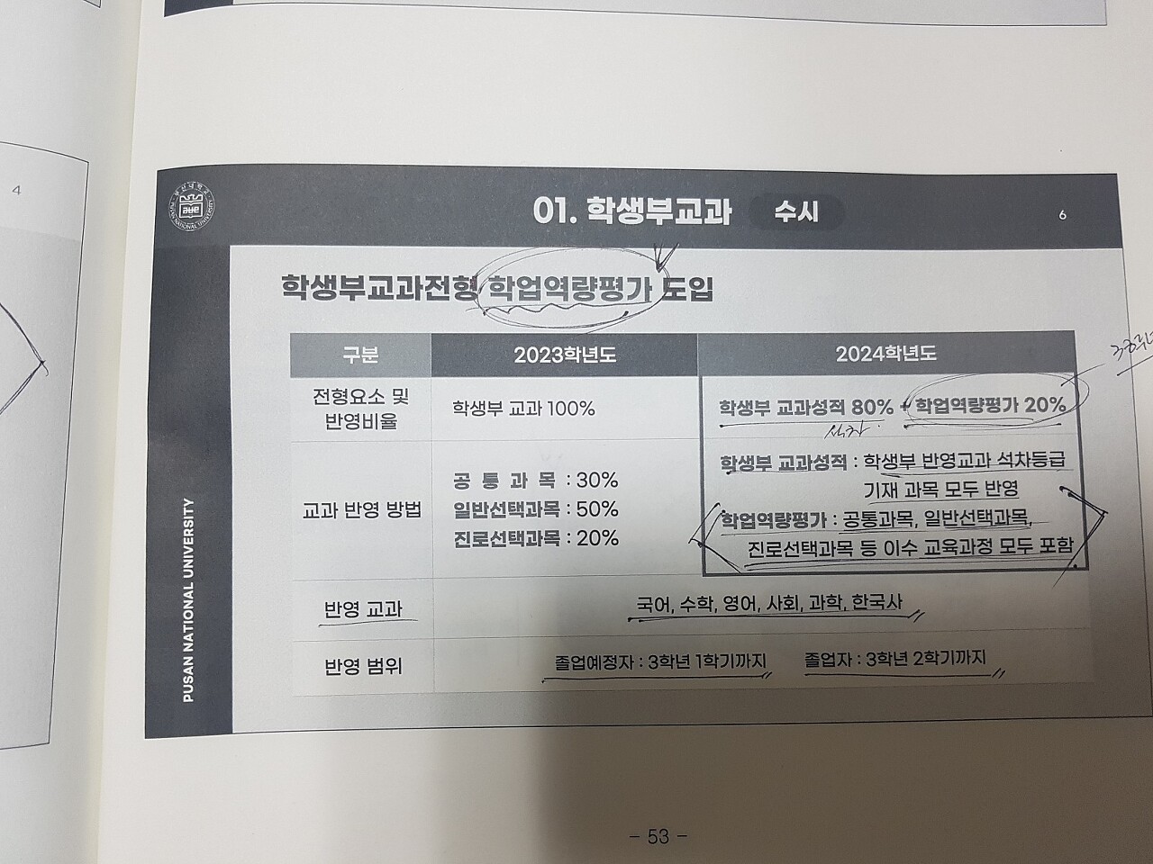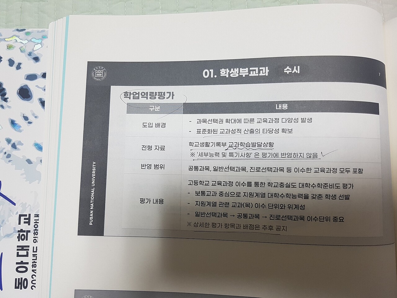 부산대는 24학년부터 교과과목선택에따른 학업역량평가를 도입한다고 합니다. 작년까지는 교과100이였는데... 올해부터는 교과성적80%, 학업영력평가20%로 변경되었네요~