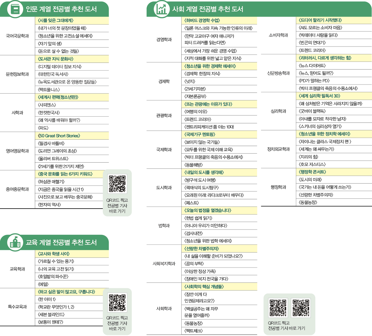 2022년 4월 말 시작된 ‘쌤과 함께! 깊이 읽는 전공 적합書’ 시리즈가 끝납니다. 1년여간 총 47개 전공을 다뤘습니다. 추천 도서는 232권에 달하죠. 새 독서 시리즈를 선보이기에 앞서 3회에 걸쳐, 각 계열의 전공별 추천 도서를 모아 안내합니다. 같은 책을 두고, 다른 전공을 희망하는 선배들이 어떻게 읽고 활용했는지도 소개합니다. 자문 교사단이 엄선한 추천 도서와 대학생 선배들의 생생한 경험담을 참고해 책 읽기에 도전해보길 바랍니다._ 편집자
