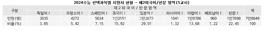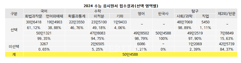영역별 응시 지원자 수는 △국어 50만1321명(99.4%) △수학 47만8083명(94.7%) △영어 49만8502명(98.8%) △한국사 50만4588명(100%) △탐구 49만2519명(97.6%) △제2외국어/한문 7만8849명(15.6%)이다.