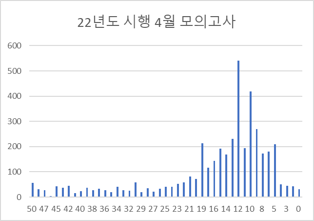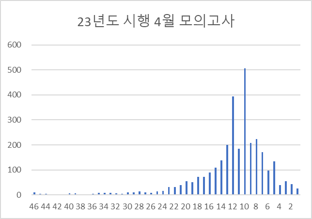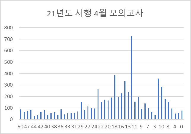 적어도 4월 모의고사에서는 반대로 '소수의 하위권(원과목 인원을 생각하면 상당히 소수)의 유입으로 전체 분포가 큰 변동이 생긴 상황'이 되어버렸습니다.