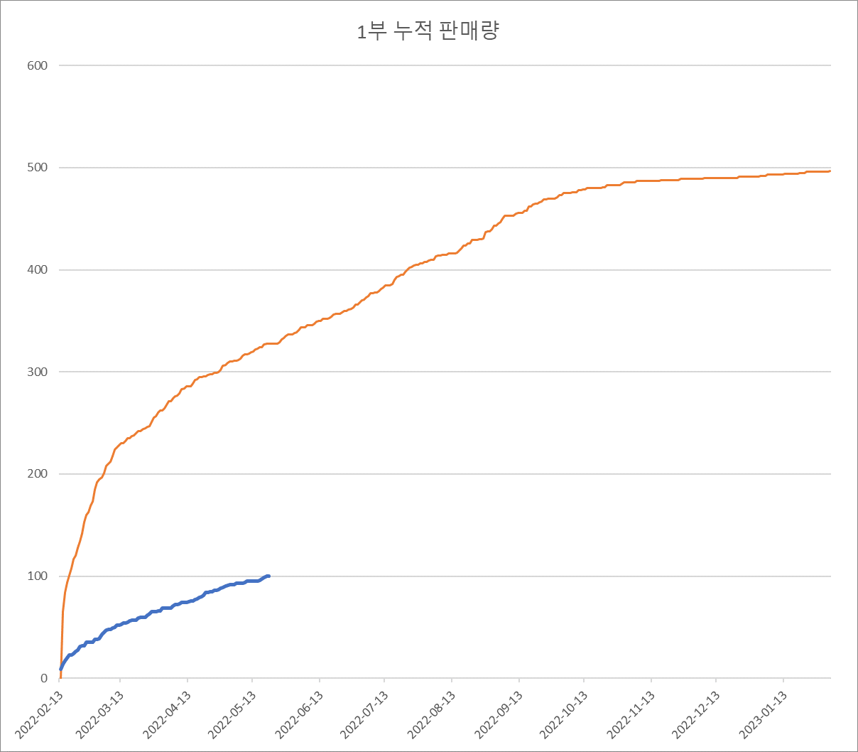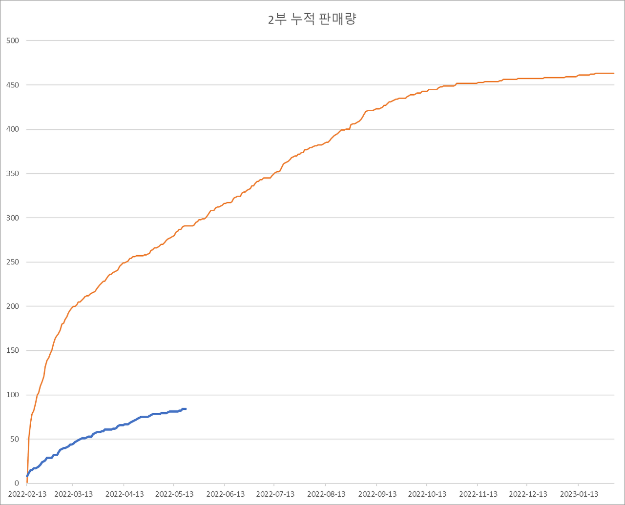 주황색이 작년 어나클 판매 누적 지표, 파란색이 올해 어나클 판매 누적 지표입니다.