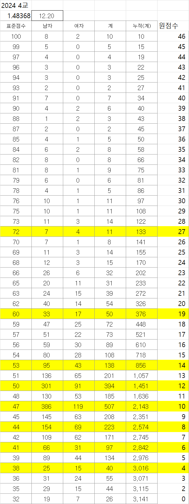 실제 50점의 표준점수는 이론상 106점에 해당하나 표준점수 최고점이 100점으로 고정되어 있기 때문에 이런 결과가 나온 것입니다. 46~50점이 모두 표준점수 100점입니다.