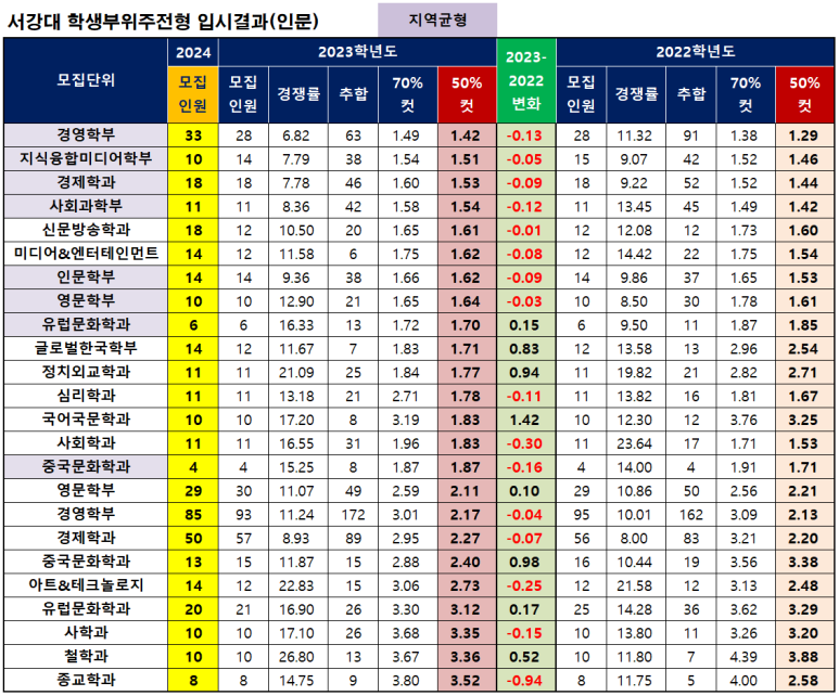 서강대는 모집단위가 많지 않아서 전형별, 계열별로 구분하지 않고 지역균형과 학생부종합전형을 같이 정리했다. 전반적으로 지역균형(2023학년도까지 고교장추천)의 합격선이 높은 수준이고, 중국문화학과 등의 일부 학과들 합격선이 낮은 편이다.