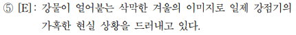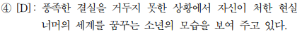 '풍족한 결실을 거두지 못한 상황', 그 속에서 무언가를 지향하는 모습. 희망적인 메시지 때문에 조금 애매하기는 하지만, 어쨌든 주제를 포괄할 수 있는 선지입니다.