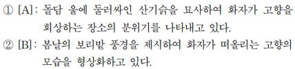 [A]. [B]가 어딘지 몰라도, '고향 회상'이라는 주제와 관련되어 있는 선지들입니다. 맞다고 칩시다.