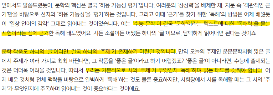 수능 국어라는 시험은 결국 '독해력'을 묻는 시험이고, 이는 문학에서도 마찬가지라는 것, (물론 문학은 +@가 있긴 합니다.) 그리고 '독해력'을 묻는 데 있어 가장 기본적인 물음은 '주제를 찾았니? 그러니까 이 글이 하고 싶은 말이 뭔지 알겠니?'이고, 나아가 '시'에도 주제가 존재하기 때문에 '주제'를 정확하게 체크했는지가 핵심이 된다는 내용입니다.