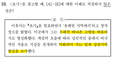 현대시의 주제를 가장 잘 알려 주는 것은 <보기>입니다. <보기>가 있으면 그로부터 주제를 정확하게 체크하는 습관을 들이시는 것이 좋습니다. '초가'라는 작품의 주제는 '오래전 떠나온 고향 떠올리기', '악화되어 가는 일제 강점기의 현실 묘사'네요. 지문을 보지 않고, 이 주제만을 가지고 선지를 판단해 보겠습니다.