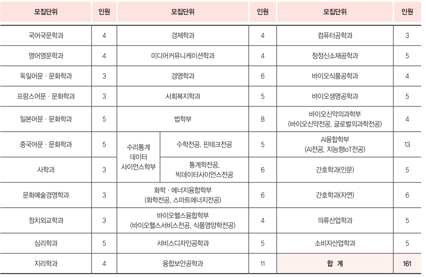 ▶ 인문계열 : 11월 2일(토) - 10:00 ~ 12:00 국어국문, 사학, 철학, 영미인문, 경제, 무역, 경영 - 15:00 ~ 17:00 법학, 정치외교, 행정, 도시계획부동산, 상담 미디어커뮤니케이션학부, 한문교육, 특수교육 ▶ 자연계열 : 11월 16일(토) - 10:00 ~ 12:00 공학계열광역 - 15:00 ~ 17:00 전자전기공, 융합반도체공, 고분자시스템공학, 토목환경공, 기계공, 화학공, 건축학부, 소프트웨어학, 컴퓨터공, 모바일시스템공, 통계데이터사이언스, 사이버보안학, 수학교육, 과학교육 |
