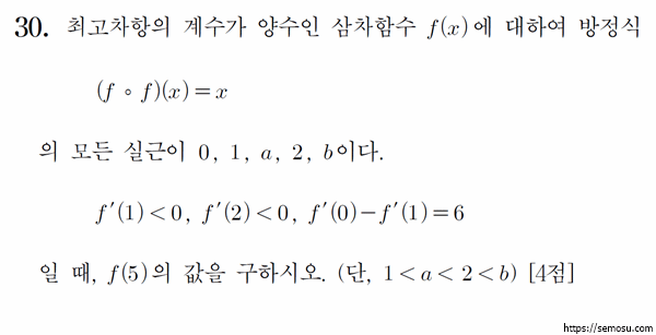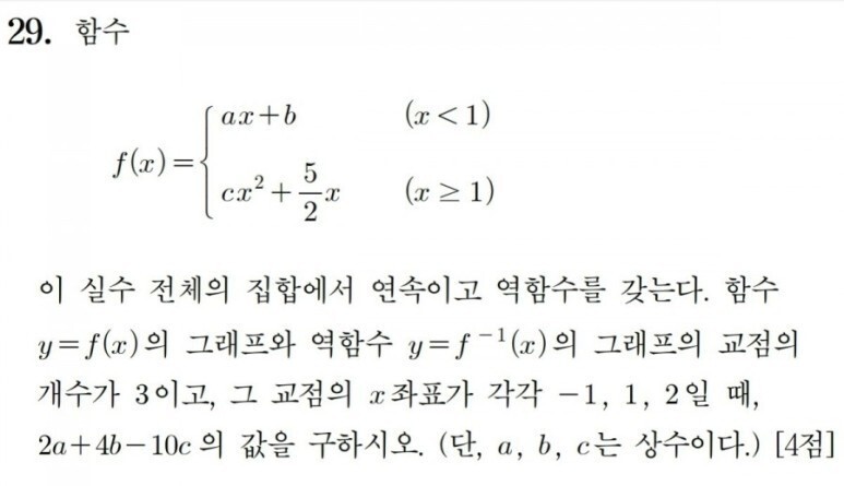 오답률 93%를 기록한 문제였습니다. '어떤 함수가 감소하는 함수라면 그 함수와 그 함수의 역함수의 교점은 y=x위가 아닌 곳에서도 생성될 수 있다'는 성질을 알아야 접근할 수 있었죠