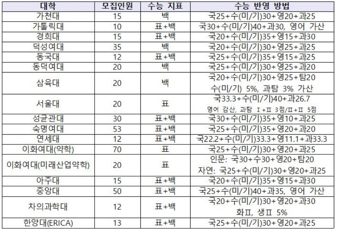 <2024학년도 서울 및 수도권 약대 정시 일반전형>