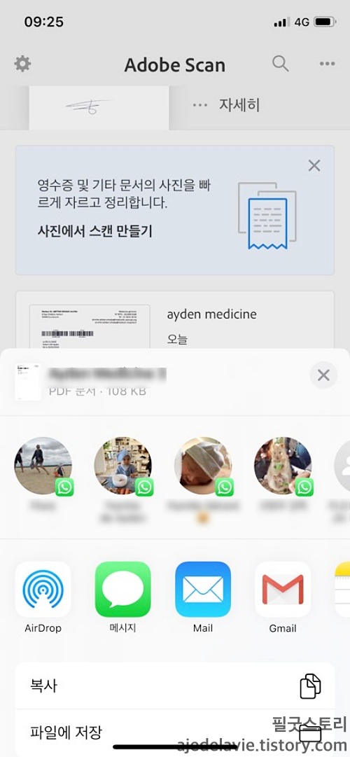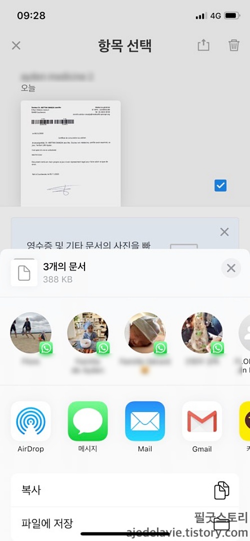 사본 공유를 누르면, 아래와 같은 화면이 나타난다. Whatsapp의 대화창과 같이 SNS로 사본을 보낼 것인지, 메일을 이용할 것인지 본인이 선택할 수 있다.