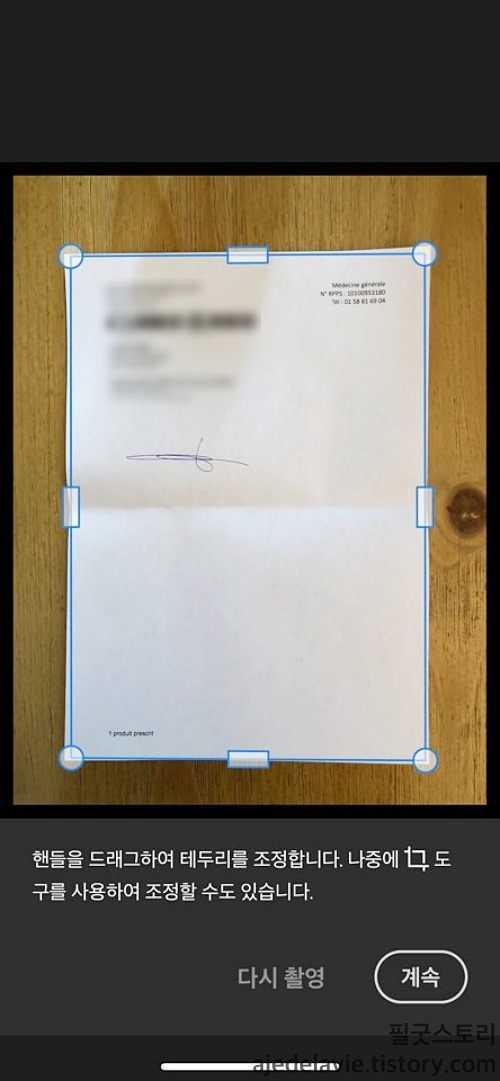 애플리케이션이 문서를 인식하여 pdf화 할 문서의 테두리를 자동으로 설정해준다. 만약 설정이 잘못되었을 경우 수동으로 수정할 수 있지만 거의 정확하다.