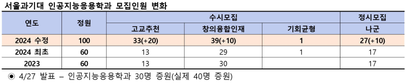 서울과기대도 기존의 인공지능응용학과 모집인원이 30명 늘어나는 것으로 발표되었는데 실제 인원은 40명이 증원되었다. 수시모집요강만 발표가 되어서 정시모집인원을 정확하게 확인하지는 못했지만 2024학년도 수시모집요강에 정원내 모집정원이 60명에서 100명으로 늘었기 때문에 정시모집에서도 10명이 늘었다고 볼 수 있다.