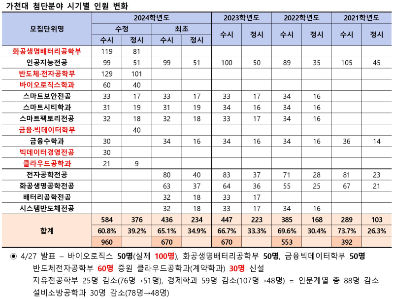 2022학년도에 인공지능응용학과(60명), 지능형반도체공학과(30명), 미래에너지융합학과(30명)이 신설되었는데 당시에도 전체 인원은 90명이 증가해서 다른 모집단위에서 30명 정도 감소가 있었는데 이번에도 인공지능응용학과가 교육부의 증원 30명 외에 10명을 추가로 증원했기 때문에 다른 모집단위에서 조금씩 인원이 감소했다.