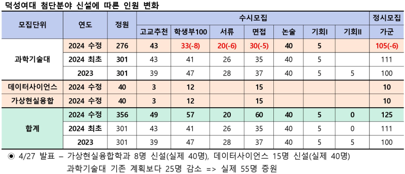 - 덕성여대 = 교육부 발표 23명 증원, 실제 55명 증원(+32명)