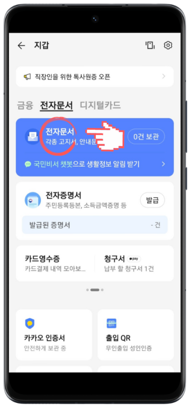 2) 지갑의 '전자문서' 배너에서 전자문서 아이콘을 클릭합니다.