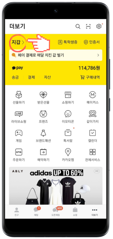 1) '카카오톡' 어플에서 '더보기'메뉴에서, 좌측 상단의 '지갑' 메뉴를 클릭합니다.