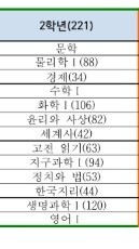 화학1 (106명), 생명과학1(120명), 지구과학 1(94명) 3과목이 거의 1/3씩 수강인원이 나뉜다.
