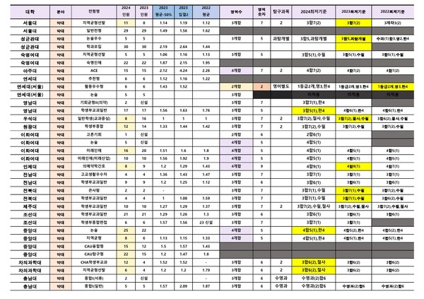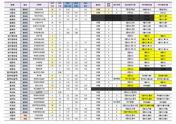 22와 인원변화는 비교하지 않았는 데 경희대의 경우 22에서 23으로 오면서 인원이 줄었습니다. 올해도 마찬가지로 인원변화가 있는 곳도 있습니다. 입결을 볼 때는 최저의 변화 인원의 변화를 함께 고려해서 가감을 해서 보아야 합니다.