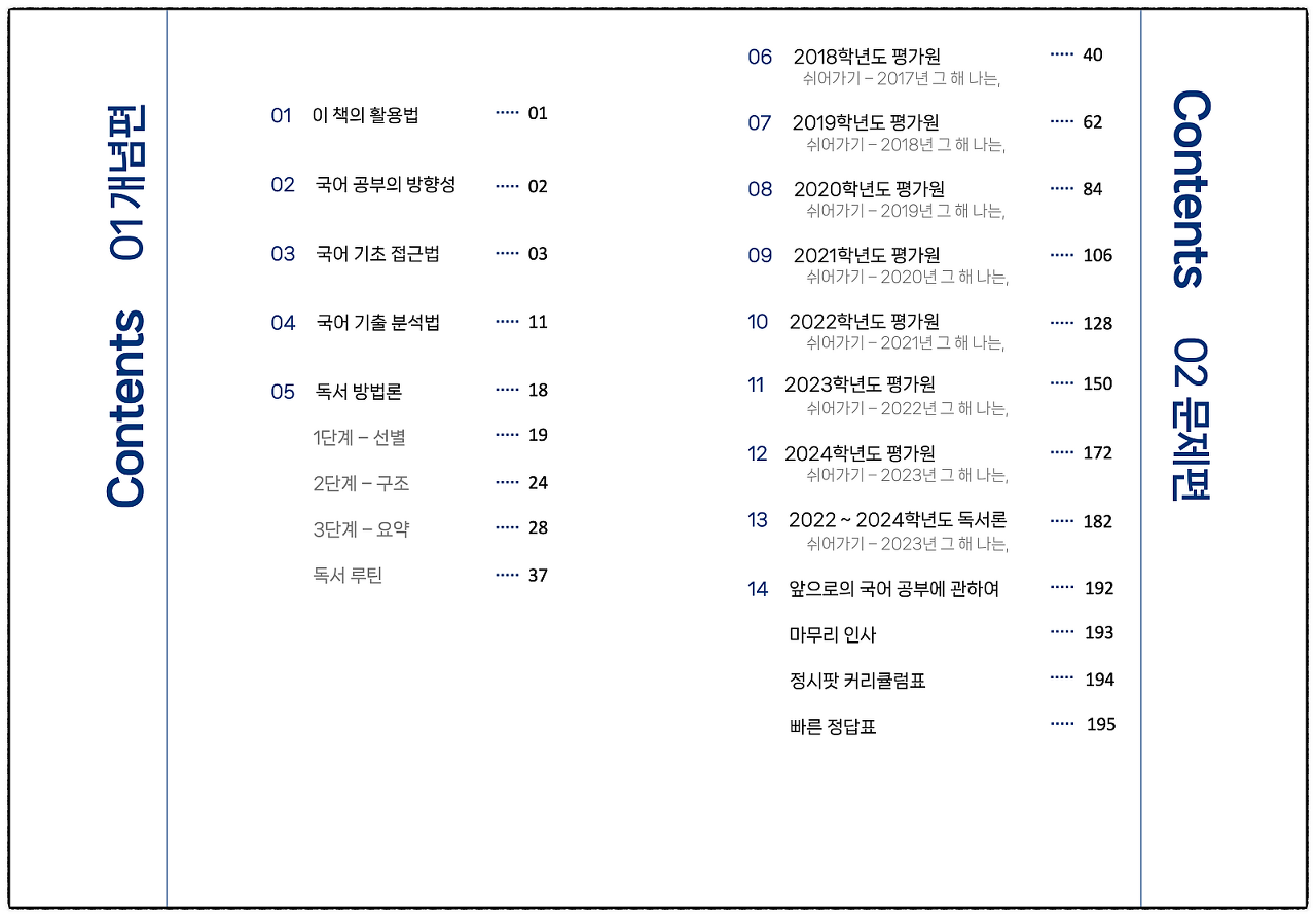 이 책에는 국어의 방향성, 국어 기초 접근법, 국어 기출 분석법, 비문학 방법론, 방법론 연습 지문이 모두 들어 있어요!