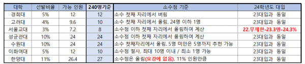 240명을 기준으로 하면 학교별 추천인원은 아래와 같습니다.
