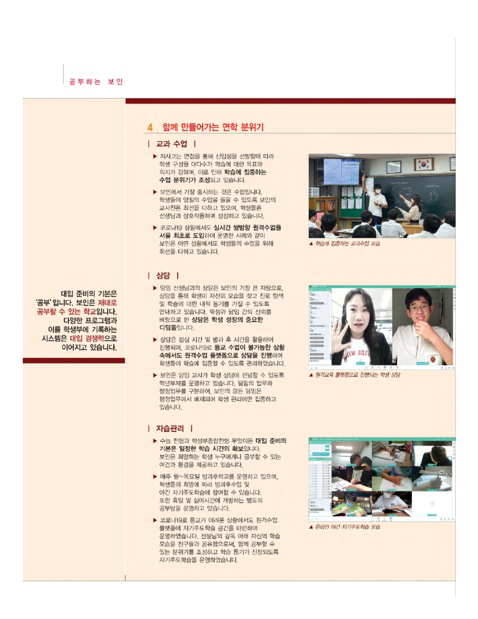 풍성한 자율활동/창제활동도 학교의 특징이라고 할 수 있다. 대표적인 활동으로는 인문과학열전, 통섭, 리더쉽 및 창의인성 프로그램(이런 활동 안하면 보인고 온 의미가 없다. 꼭 신청하자) 등이 있으며, 대부분 보인아이에서 참가 신청이 가능하다. 프로그램에 참여한 뒤에 보고서를 써서 제출하면 활동내역을 생활기록부에 기재할 수 있으므로, 마음만 먹으면 어느 학생이든 생기부를 쉽게 관리할 수 있다. 여담으로, 한 교사가 창체 활동 관련으로 인터뷰를 한 기사가 있다.