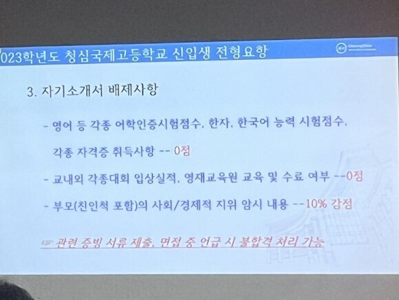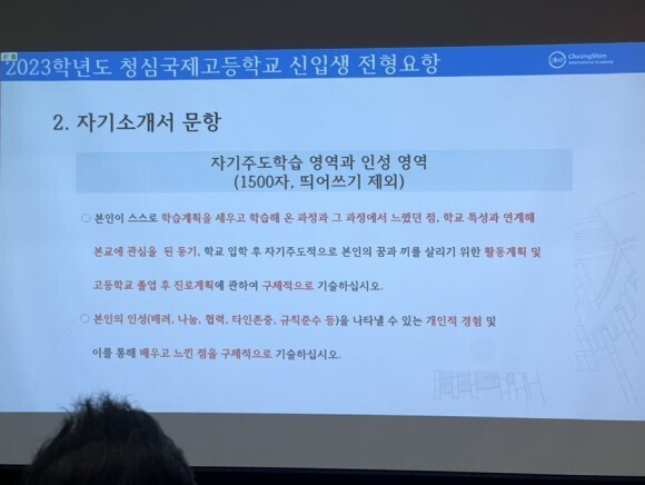청심 국제중은 초등학교 생활기록부가 1차 서류입니다. 추첨제로 1차 통과하면 그 땐 자기소개서를 제출합니다.