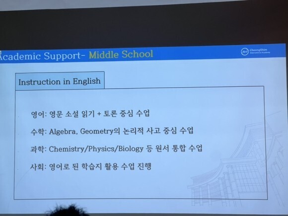 학교 교수과정은 국제 특성화에 걸맞게 영어비중이 상당히 높은 편 입니다. 중학교 같은 경우엔 초등에서 보는 학력평가가 없어서 영어가 합격여부에 큰 비중을 차지 않는다고는 하지만 개인적으로 느낀 건 최소 AR 4점대 후반정도는 되어야 어느정도 수업에 따라갈 수 있을 것 같단 생각이 들었습니다.