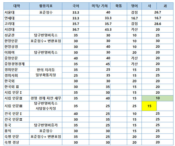 시립대가 탐구반영비중이 10%입니다. 상위권에서 서강대 바로 아래에서 시립대가 교차지원이 많은 이유입니다.