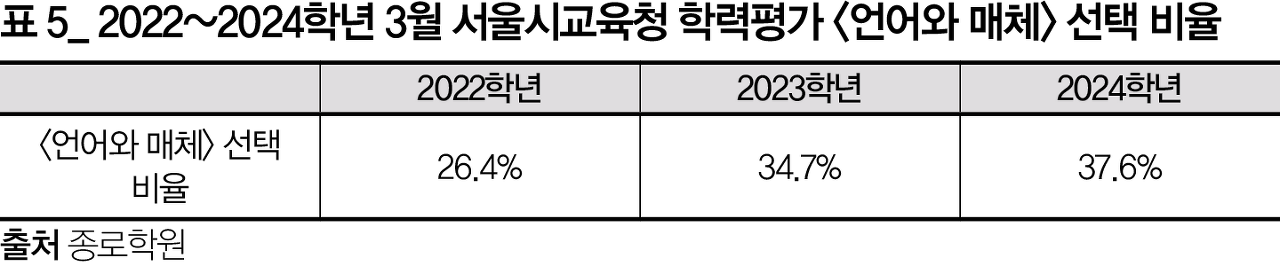 상위권이 아니더라도 <언어와 매체>를 선택하는 비율이 늘고 있다. 2022학년 수능에서 <언어와 매체> 선택 비율은 30%였지만 2023학년 수능에서는 35.1%였다. 최근 3개년 3월 교육청 학력평가에서도 <언어와 매체> 선택 비율은 26.4%(2022학년), 34.7%(2023학년), 37.6%(2024학년)로 꾸준히 증가했다(표 5).