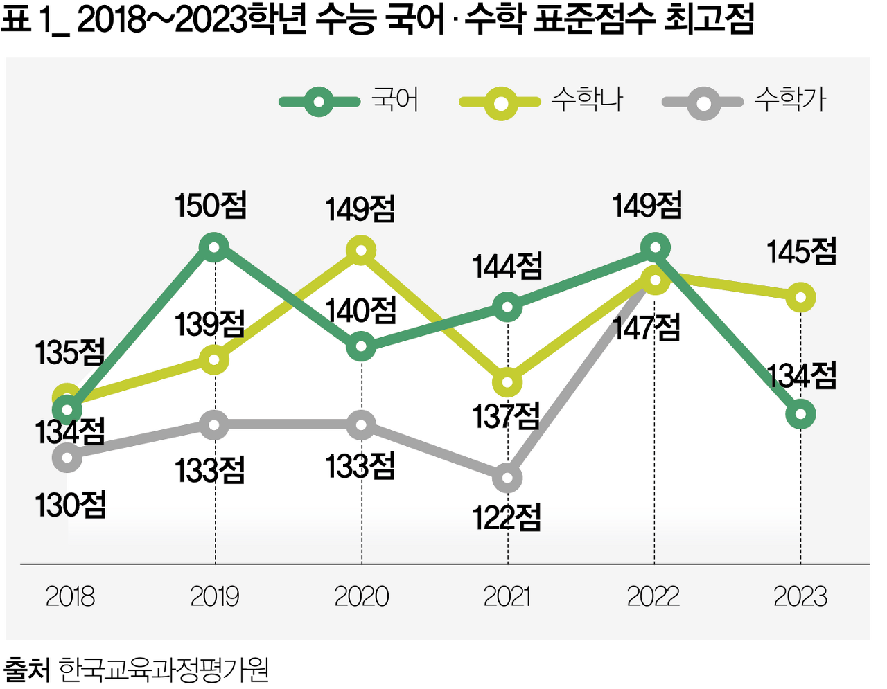 최근 수년간 국어의 표준점수 최고점은 수학보다 높았다(표 1). 표준점수 최고점이 높다는 건 시험이 그만큼 어려웠다는 뜻. 작년 수능에서 수학이 다시 그 자리를 되찾았지만, 지속된 국어 포비아(공포증)는 쉽게 사라지지 않고 있다. 특히 최근 치러진 두 번의 수능에서 국어의 표준점수 최고점 차이는 15점에 달해, 널뛰는 난도를 좀처럼 예상하기 어렵다는 하소연이 이어지고 있다.