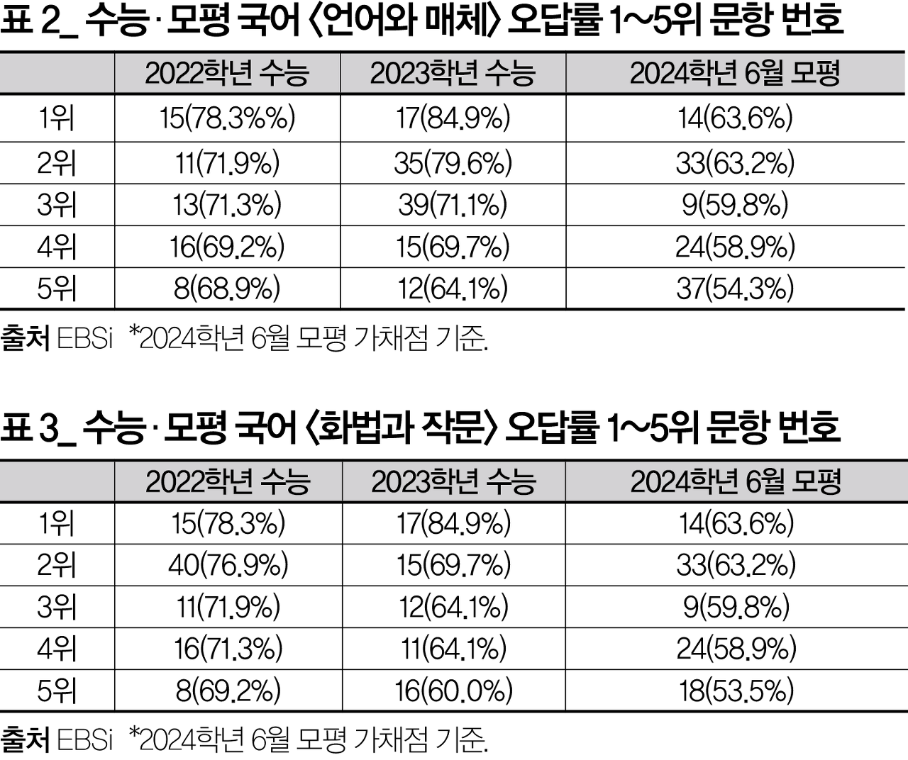 오답률이 높은 문항을 살펴보면 이를 좀 더 확연하게 알 수 있다. 국어는 대개 1~17번 문항은 <독서>, 18~34번 문항은 <문학>, 35~45번은 <언어와 매체> 또는 <화법과 작문>에서 출제된다. 2023학년 수능과 2022학년 수능에서 오답률 1~5위 중 <문학> 영역(18~34번)은 없었다. 하지만 이번 모의평가에서는 <문학> 영역에서도 오답률 상위 5위 안에 들어가는 문제들이 출제됐다. <언어와 매체>의 경우 33번과 24번이 각각 오답률 2위, 4위를 차지했다. <화법과 작문>의 경우 33번, 24번, 18번이 각각 2위, 4위, 5위를 차지했다(표 3).