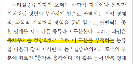 '콰인'의 논증이 '총체주의를 정당화하기 위해 지식의 구분을 부정하는' 논증이라는 내용을 빼먹고 그냥 '총각 논증' 식으로만 기억하다가 정보량에 압도당하기도 하죠. (여기서도 노란 형광펜 부분의 '총체주의'라는 같은 말을 활용하면 정보량을 확 줄이는 것이 가능하죠.)