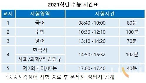 이 사진에서 확인할 수 있듯이, 대학수학능력시험은 한 과목당 상당히 긴 시간 동안 시험이 치러집니다. 극히 일부의 학생이 응시하는 제2외국어/한문, 그리고 중요성이 매우 떨어지는 한국사를 제외하면 70분 동안 치러지는 영어가 가장 짧은 시간 동안 치러지는 시험에 해당하며, 수학은 100분이라는 매우 긴 시간 동안 시험이 치러집니다.