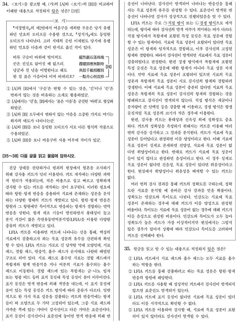 그리고 그 중에서도 이 지문은 학생들의 독해력까지 크게 요구를 했고, 5문제가 딸린 지문 치고는 지나치게 길이가 짧았으며, 이후 이어질 내용의 예측을 돕는 연결 표지가 극히 적게 등장했다는 점에서 평가원이 새롭게 선보였던 신유형이자 학생들을 변별하기 위한 새로운 실험으로 볼 수 있고, 이 실험은 말 그대로 대성공을 거두었죠.