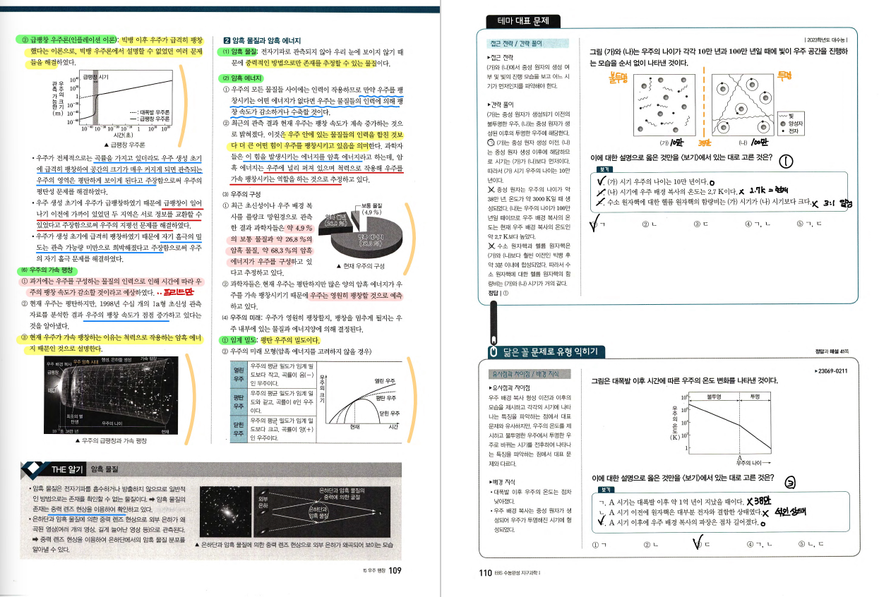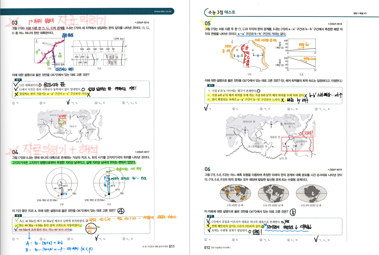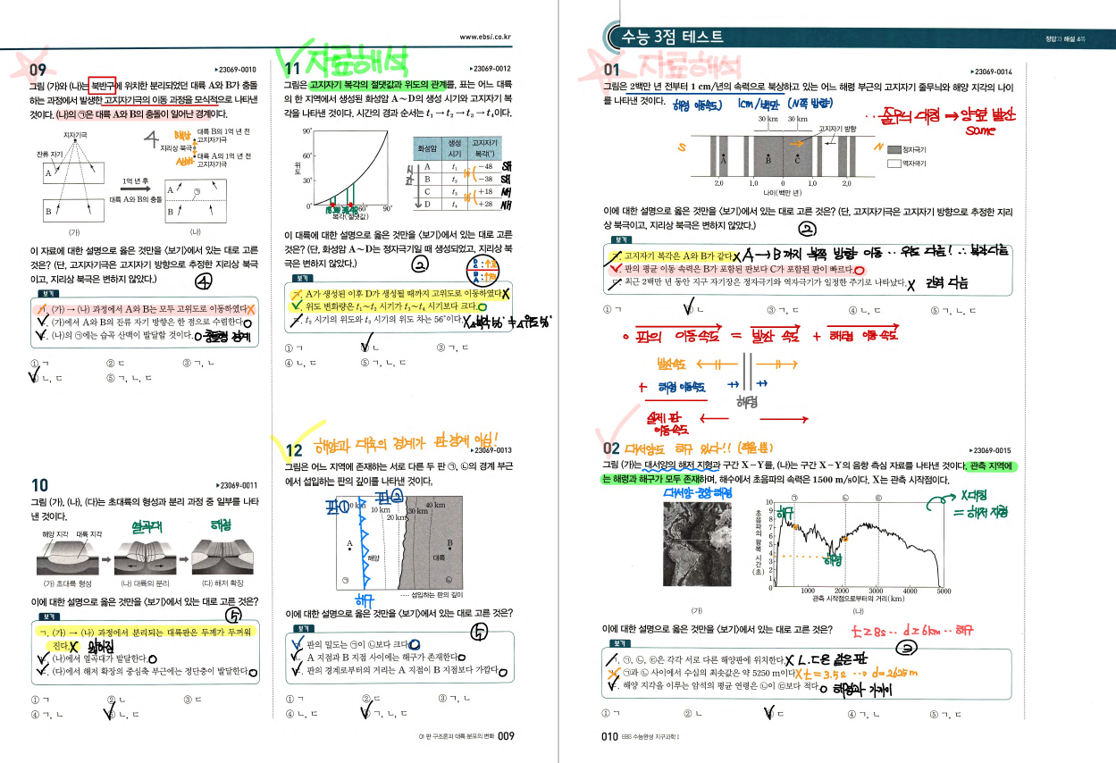 2. 지구과학은 자료분석 자체도 정확하게 보아야 하는 곳이 정해져 있습니다. 이를 전달하기 위하여 각 보기들에서 자료해석형 문항들은 색깔을 다르게 하여 문항을 풀이해 두었습니다. 주황색으로 되어있다면 자료의 주황색을 가서 읽으면 답이 나오고, 파란색으로 풀려있다면 파란색을 읽으면 답이 나오게끔 풀어두었습니다.