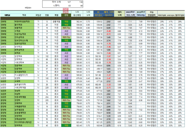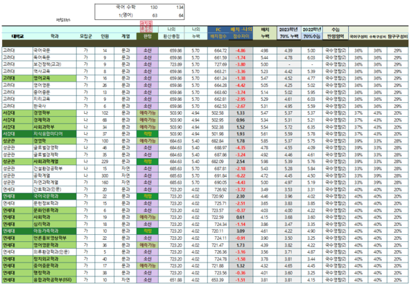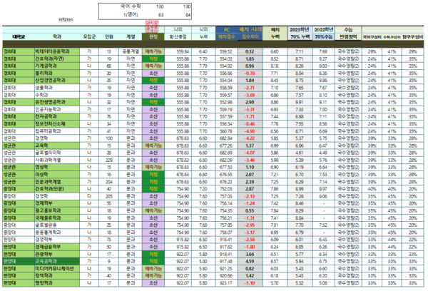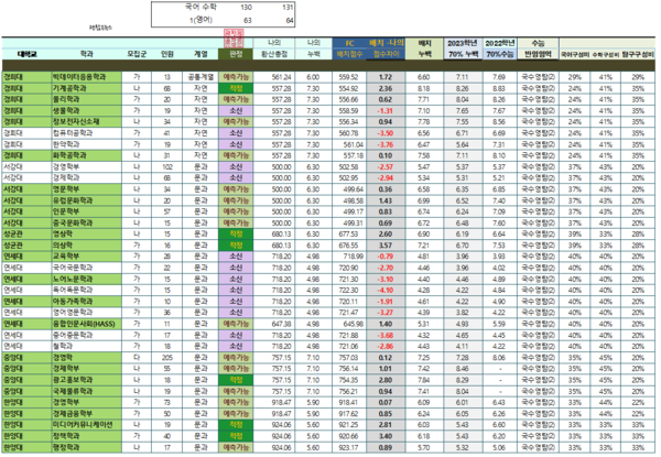 수학을 4점이 아닌 정말 어이없게 3점짜리를 틀려서 130-131 조합이 되면 어떻게 될까요? 연대 어문계열이 다시 보이기는 한데 소신지원이니 합격은 어려운 수준 욕심 내다보면 수학 130점 표점자보다 대학을 더 나쁘게 갈 수도 있는 상황이 됩니다.