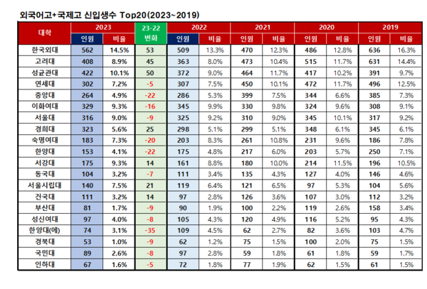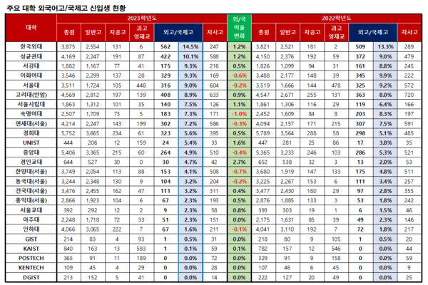 2023학년도에 외고,국제고 학생들이 100명이상 합격한 대학은 14개 대학인데 홍익대를 제외한 상위 15개 대학이다. 지방대학 중에서는 부산대와 경북대가 20위권 안에 포함되었다.