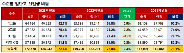 1그룹 대학의 일반고 비율이 가장 낮은 편이다. 60%를 조금 넘긴 수준에서 조금씩 상승을 하고 있다. 2그룹의 일반고 비율은 1그룹보다 10% 이상 높은 편이다.