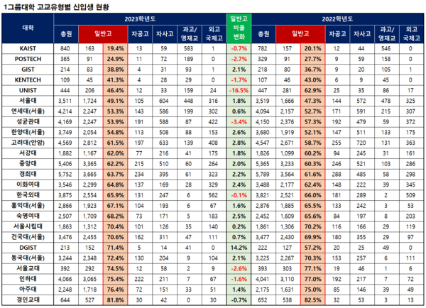 일반고 비율이 가장 크게 하락한 대학은 유니스트로 2022학년도에 62.9%에서 2023학년도에는 46.4%로 하락했다. 상대적으로 증가한 고교유형은 과고, 영재학교로 86명에서 159명으로 늘었다. 반대로 일반고 비율이 가장 많이 증가한 대학은 디지스트로 일반고의 비율이 57.2%에서 71.4%로 증가했다. 상대적으로 감소한 고교유형은 자공고와 자사고가 많이 감소했다.