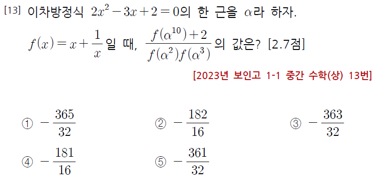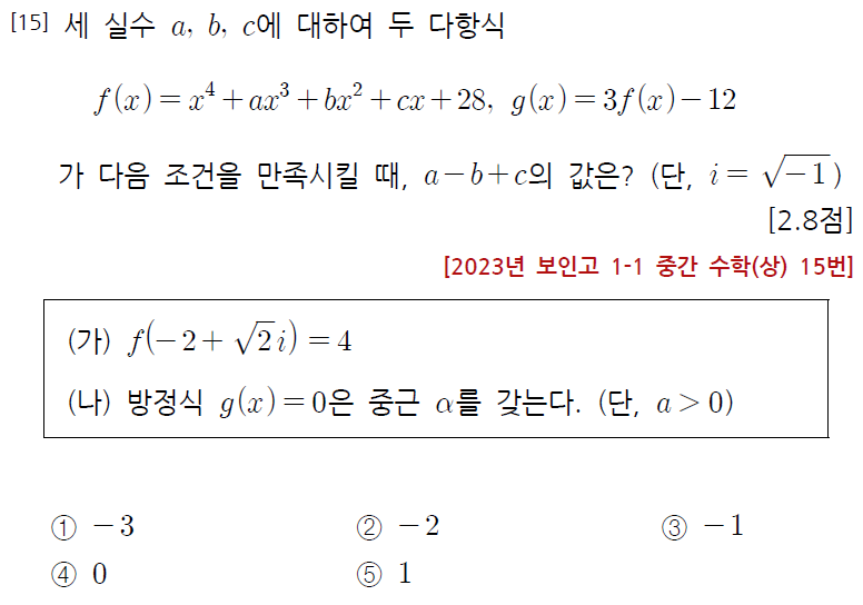 다항식의 연산과 인수정리, 그리고 사차방정식의 해를 융합한 환상적 난이도의 문제로서, 이번 시험지의 killer 문제였습니다.
