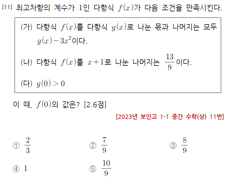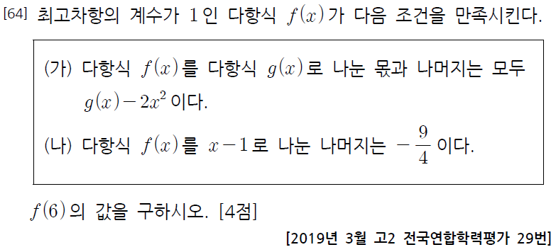 다항식의 나눗셈에 대한 응용 문제로서, 아래의 전국모의고사 기출을 변형하여 출제하였습니다.