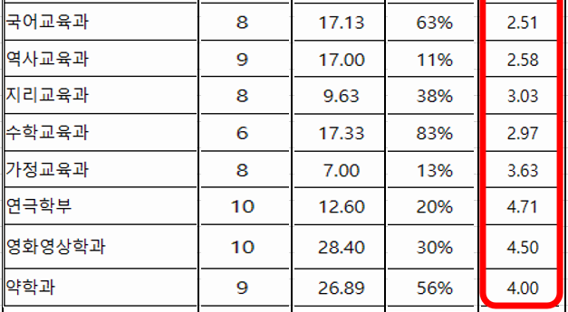 국어교육 2.51 ~ 가정교육 3.63