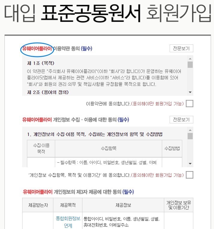통합회원가입을 클릭하면 '대입 표준공통원서 회원가입'이라고 뜨면서 '동의'해야 하는 게 쭉~ 나옵니다.