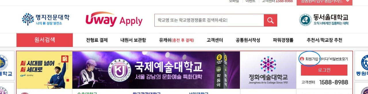 아래 동그라미 친 곳에서 회원가입을 해야 합니다. 작년에 회원가입한 재수생이라도 다시 회원가입하셔야 합니다.